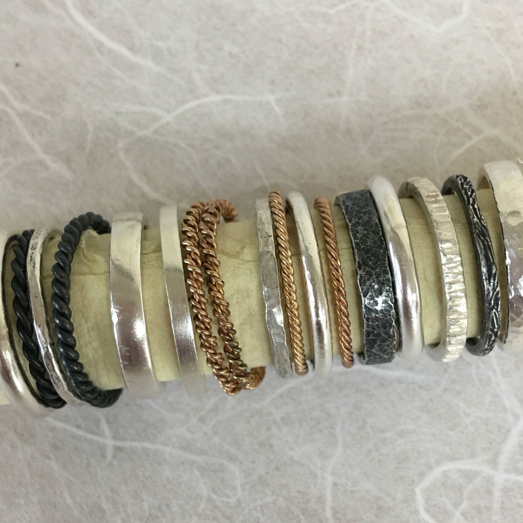 Learn to fabricate patterned wire, sawing, soldering, texturing and more using a rolling mill, torch, and hand tools. Design and fabricate two rings in this class. This fabrication class introduces you to a special rolling mill (to make patterned wire), jeweler’s torch, many jewelry-making hand tools, and studio safety. You also learn the skills of measuring with a digital caliper, sawing, soldering, forming, texturing with a hammer, and polishing. Instructor demonstrations guide you each step of the way, with ample time to work on your own projects. You fabricate two rings in this class—one using patterned wire you made, and one hammer-textured band. All materials are included in class fee.