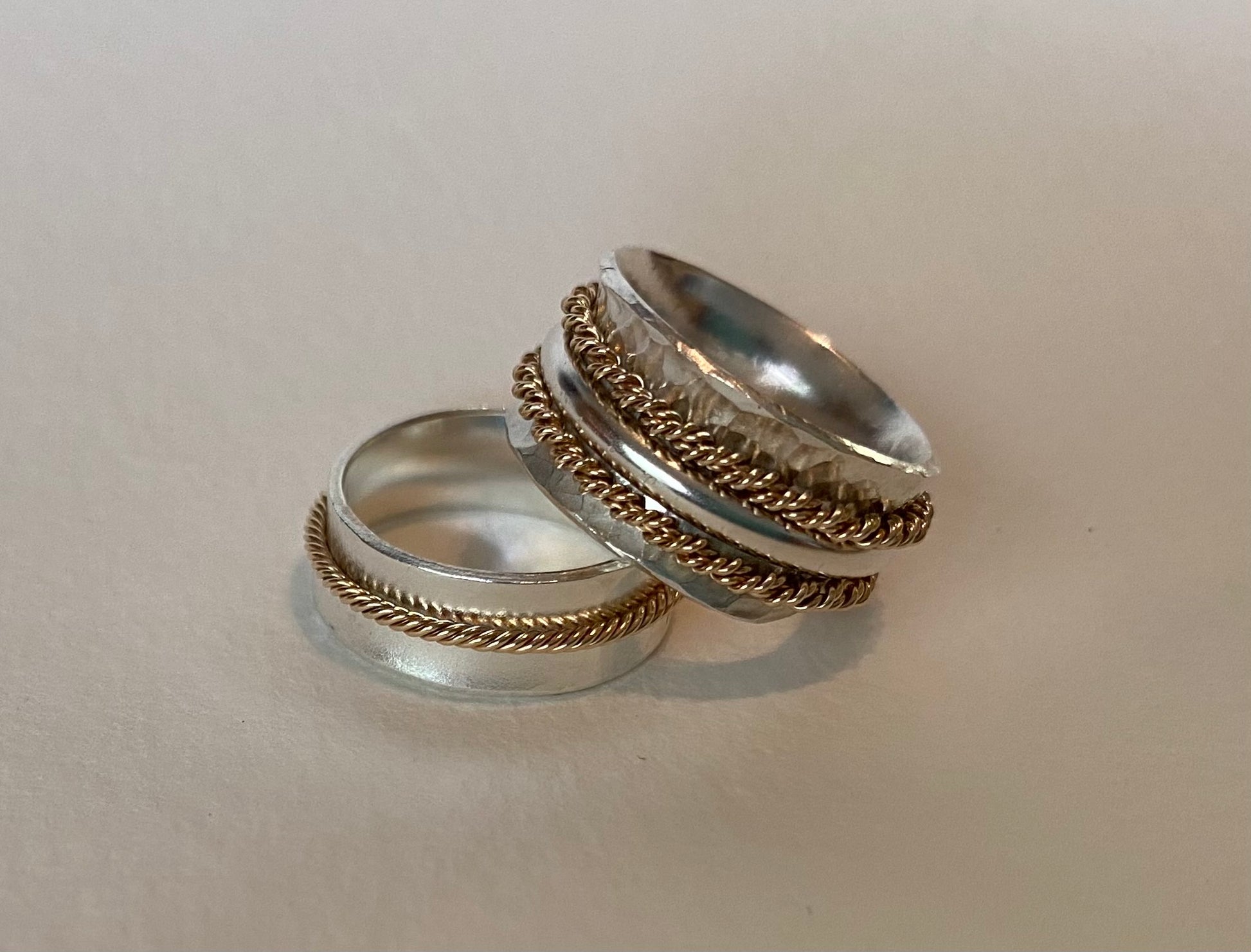 These rings are fun to make, and even more fun to wear! Spinner rings, also known as worry rings or meditation rings, are two banded rings. One band of the ring stays in place while the other spins. They originate from ancient Tibetan prayer wheels and many believe they help calm and relieve tension. Learn how to size, texture, solder, combine metals, and complete at least one spinner ring during class. You will start with the wide base ring, then choose from a variety of patterns, widths, and metals for the thin, spinning rings. You will learn to solder and forge, and learn the basics of shop safety and the tools used for this project.
